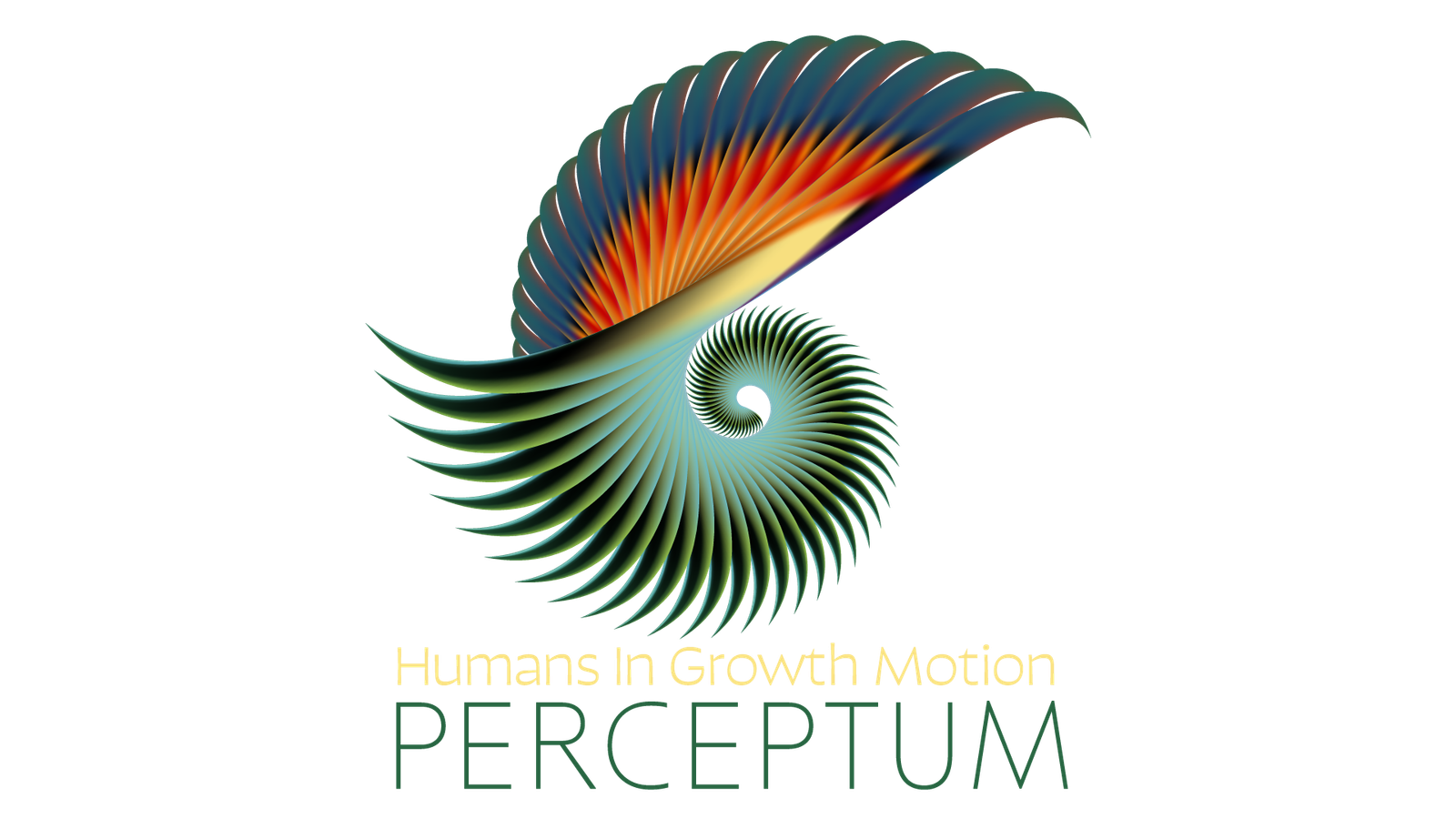 The original mark was chaotic: competing typefaces, a dense wireframe sphere, motion with no clear direction. The rebrand centers on a single form: a nautilus spiral in a gradient moving from deep teal through amber to gold. The new tagline, “Humans in Growth Motion,” earns the shape. A spiral is growth by definition. The logo holds in full color and monochrome without losing its structure.