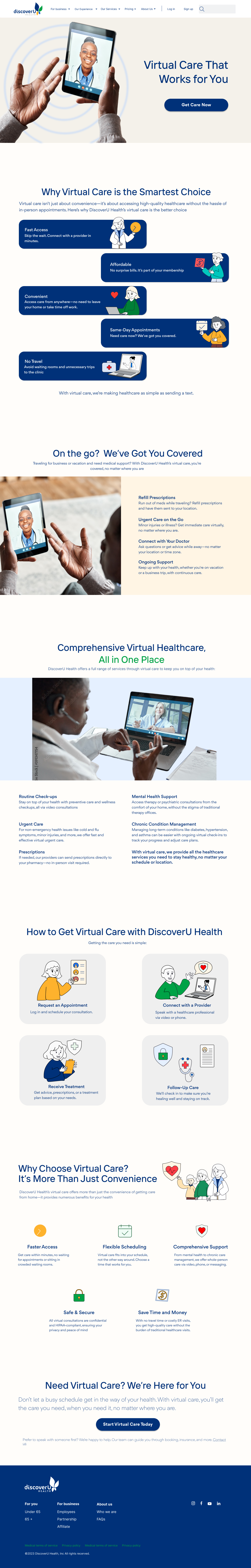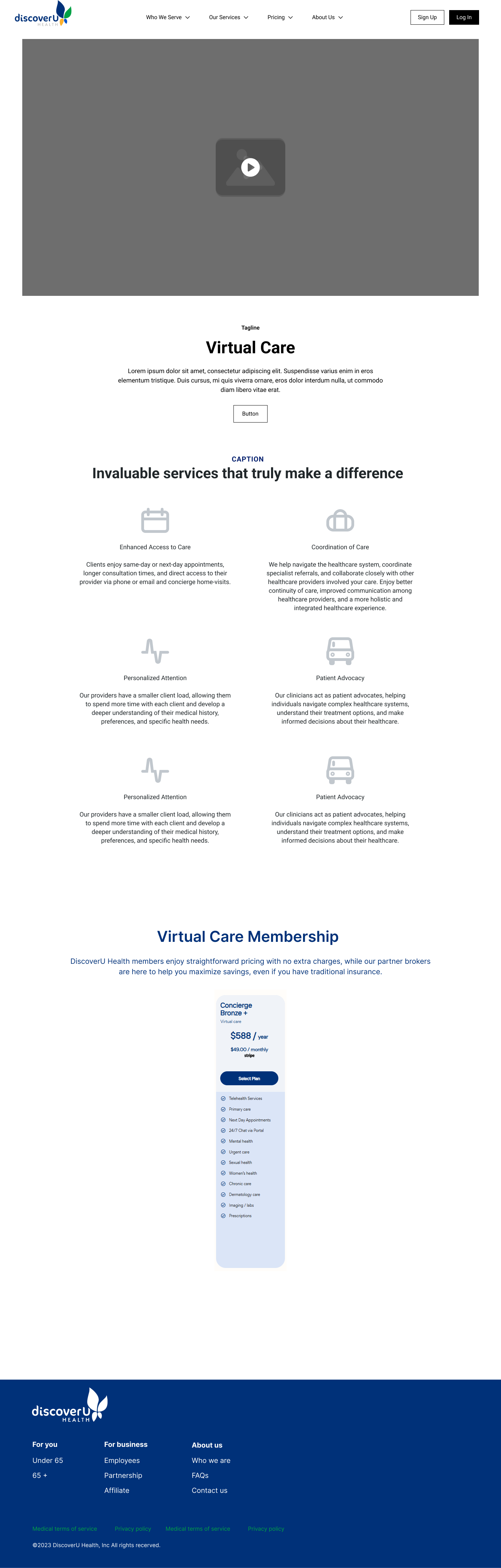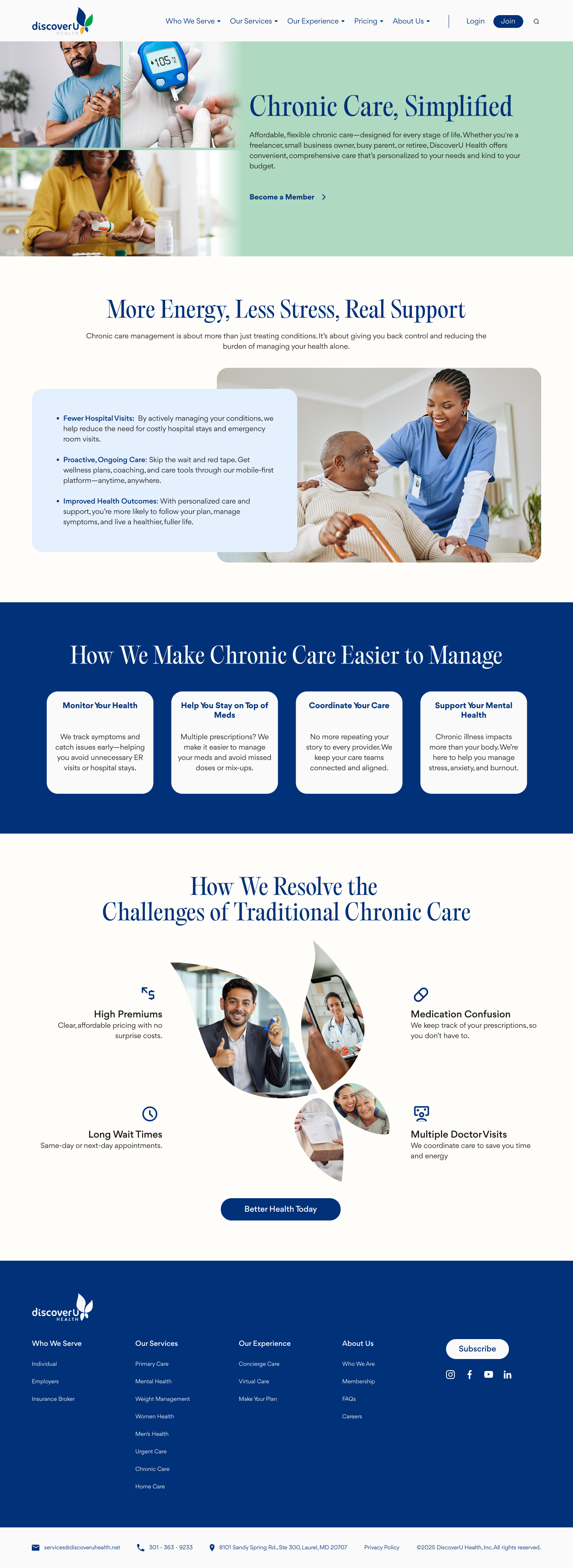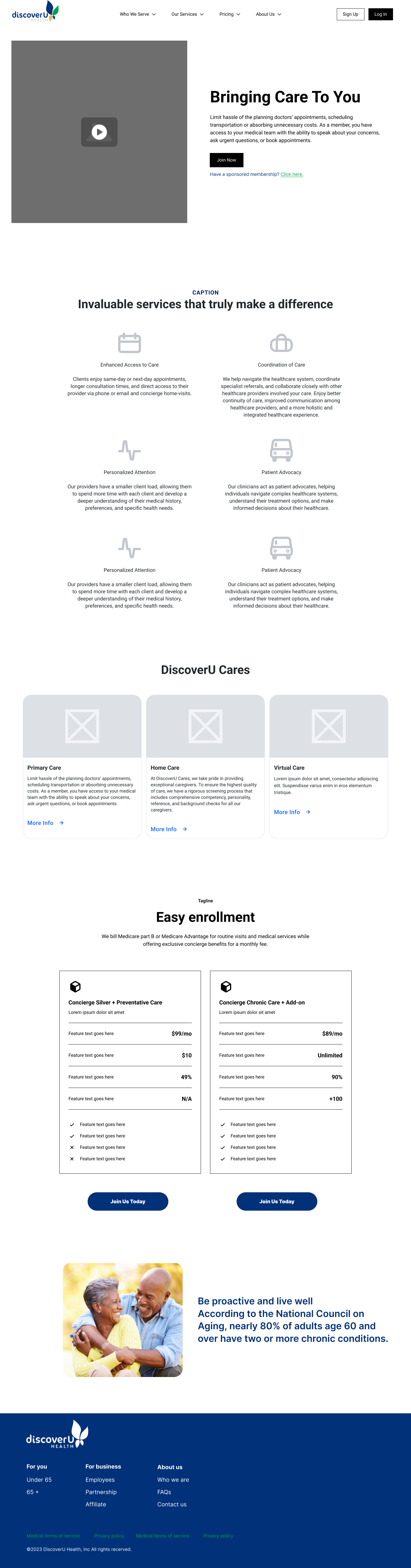 DiscoverU’s healthcare services were divided between two separate websites—DiscoverU Cares (65+) and DiscoverU Health (under 65). Resulting in a fragmented and confusing user experience. Users were forced to switch between platforms to find relevant information, encountering inconsistent branding, mismatched design patterns, and an unclear overall value proposition.