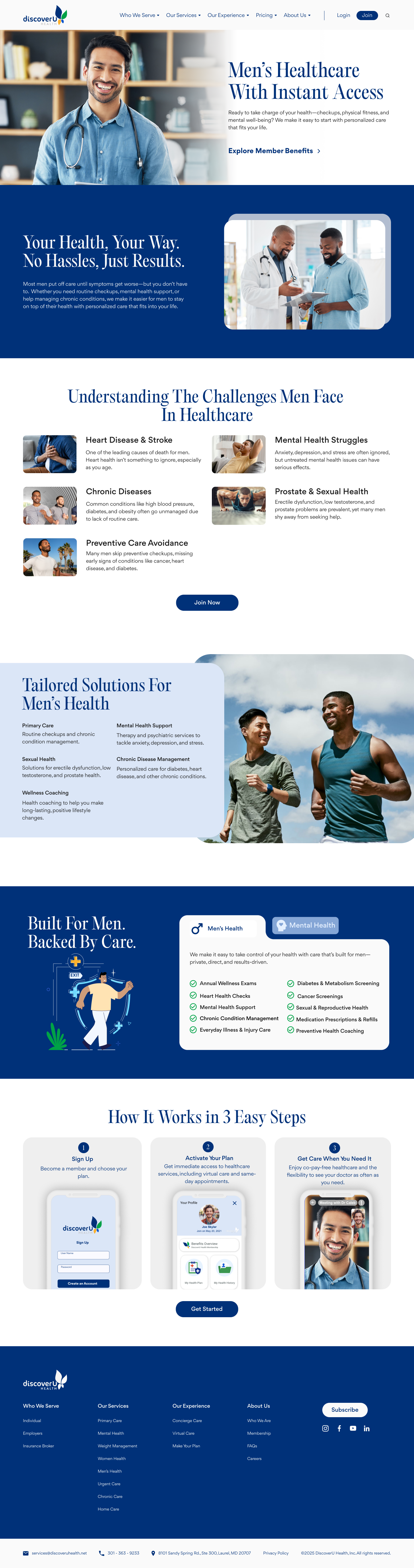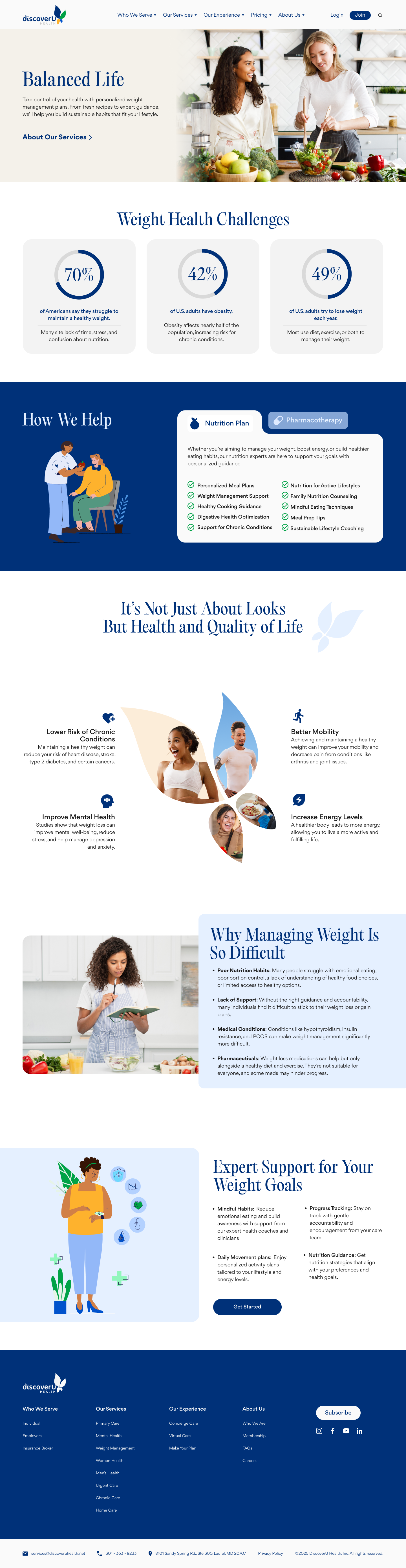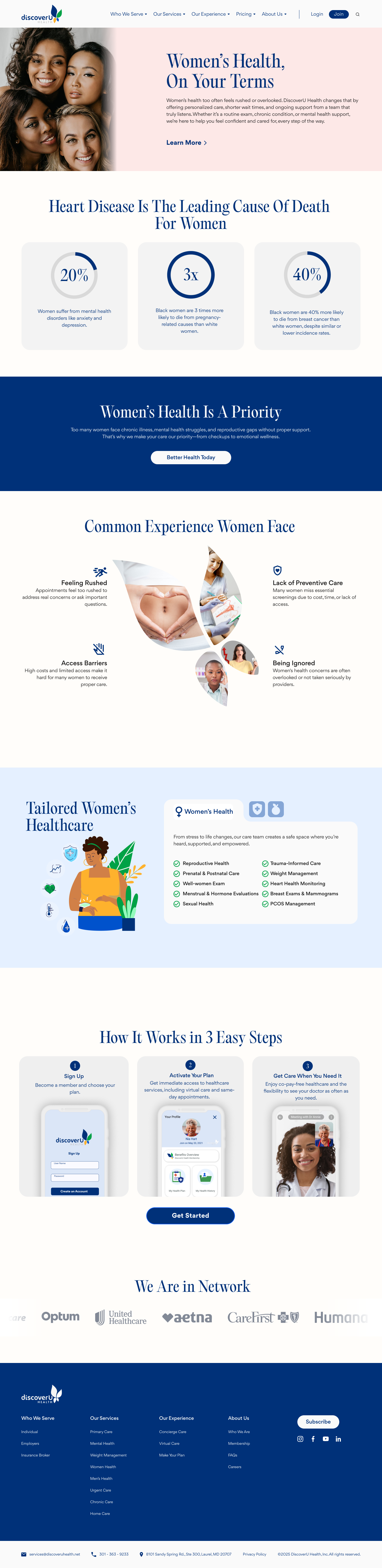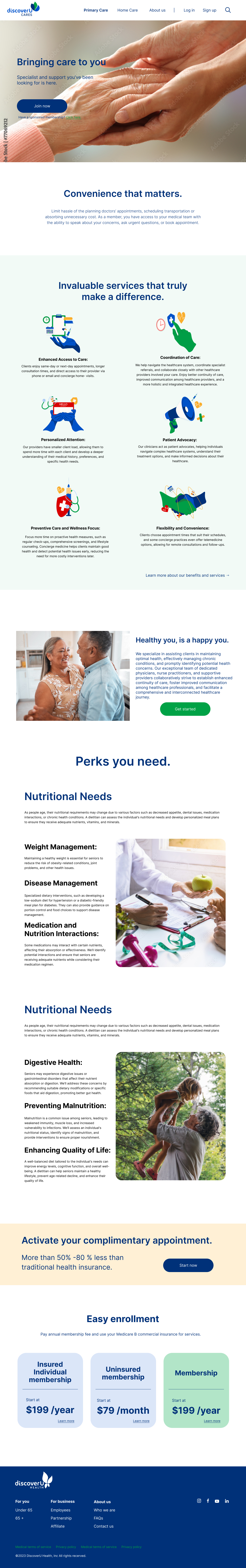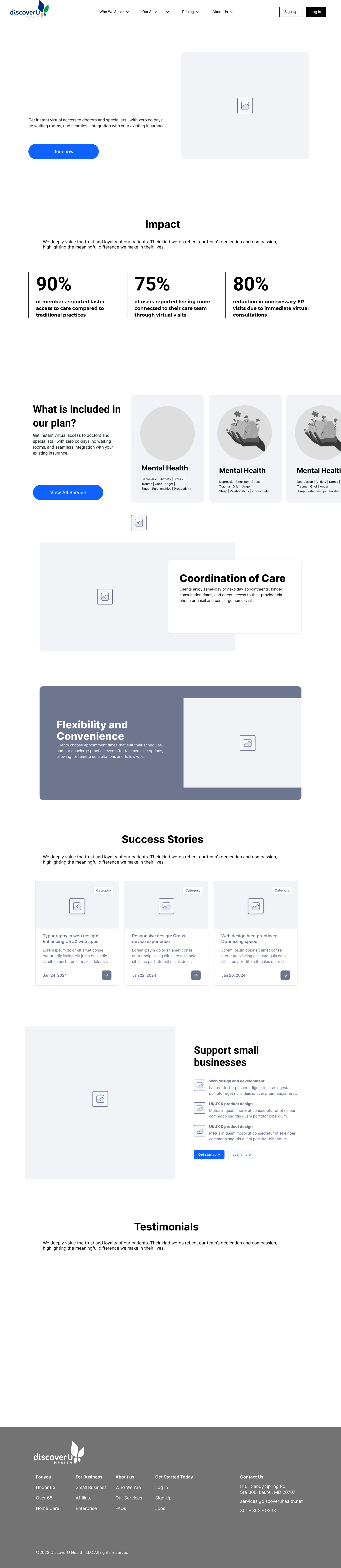DiscoverU’s healthcare services were divided between two separate websites—DiscoverU Cares (65+) and DiscoverU Health (under 65). Resulting in a fragmented and confusing user experience. Users were forced to switch between platforms to find relevant information, encountering inconsistent branding, mismatched design patterns, and an unclear overall value proposition.